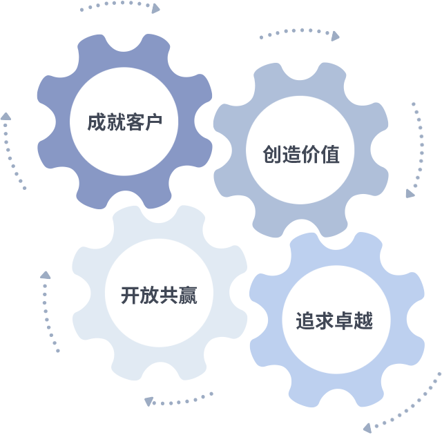成就客户是一切决策的出发点,,,创造价值是衡量所有工作的标准,,,,追求卓越是我们做事做人的态度,,,,开放共赢是我们的格局也是最终的结果。。价值观的齿轮环环相扣,,推动着组织里的每个人不断向前。。。